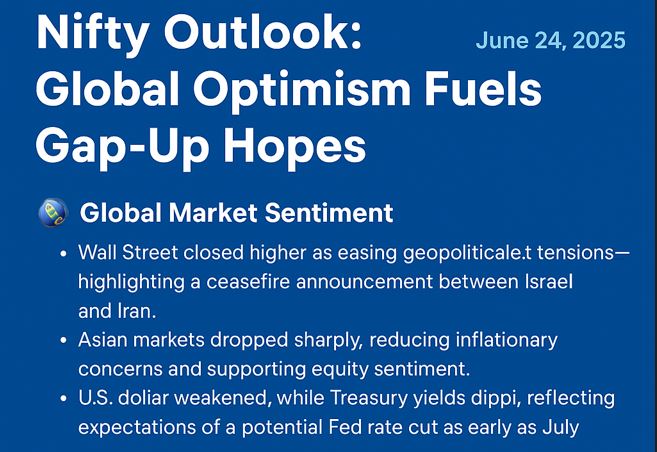 GIFT Nifty is trading around 25,175–25,206, indicating a gap-up of 180–210 points over Nifty’s previous close of 24,971.90. This suggests bullish momentum at the open, driven by global relief and improved liquidity sentiment. ? Global Market Sentiment Technical Key Takeaways